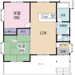 売買物件を探す エオリカ(成約済) 間取図(1階)2階ロフト有 リビング・吹き抜け リビングからキッチンを見る リビングからキッチンを見る キッチン キッチン 洗面室 洗面台 浴室 トイレ 洋室 和室 ロフト ロフト 外観 屋根付きウッドデッキ 別荘地名バケイションランド物件名/分譲地エオリカ(成約済)土地面積400㎡建物面積69.56㎡間取2LDK